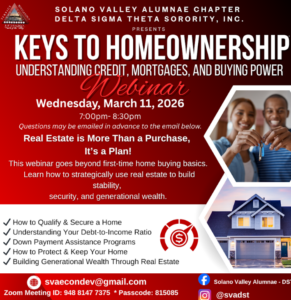 Please join the Solano Valley Alumnae Chapter in the Keys to Homeownership Webinar. An evening of understanding credit, mortgages., and buying power.